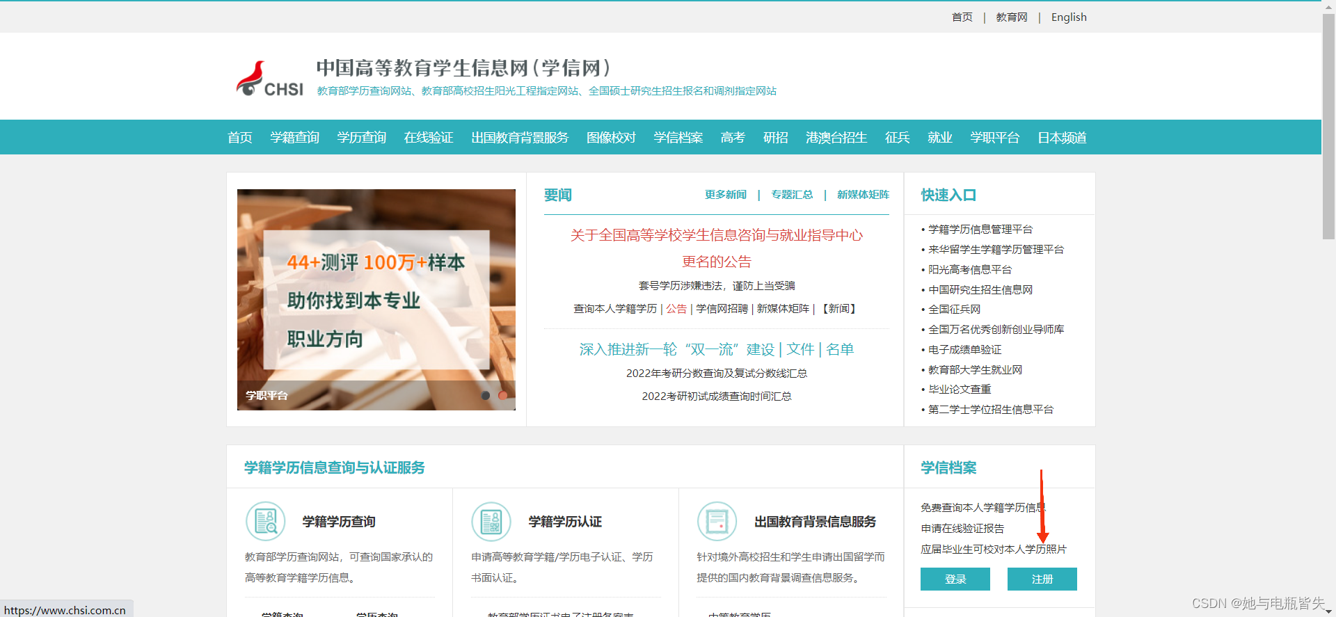 先登录学信网点此进入学信网,点击网页右下方“注册”字样进行注册(如果已经注册过的同学可以直接点击登录,如果记不得密码了也可以在登录页面找回密码)