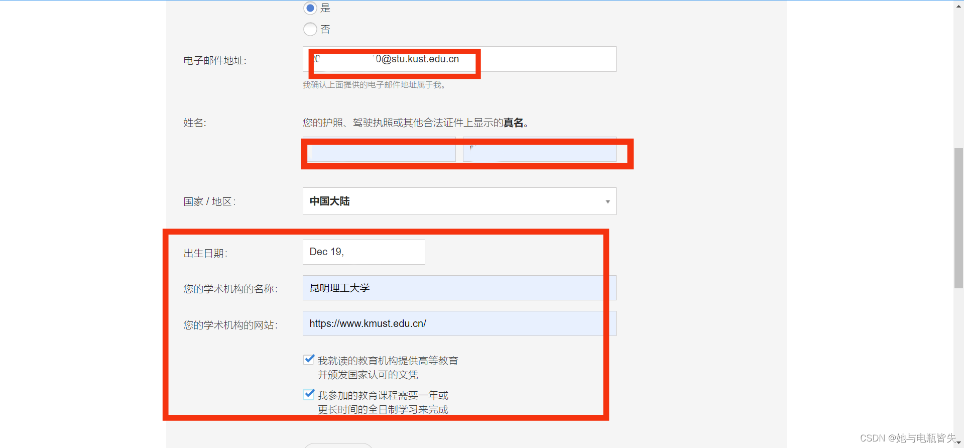 在“学术机构的名称”一栏填写“昆明理工大学”