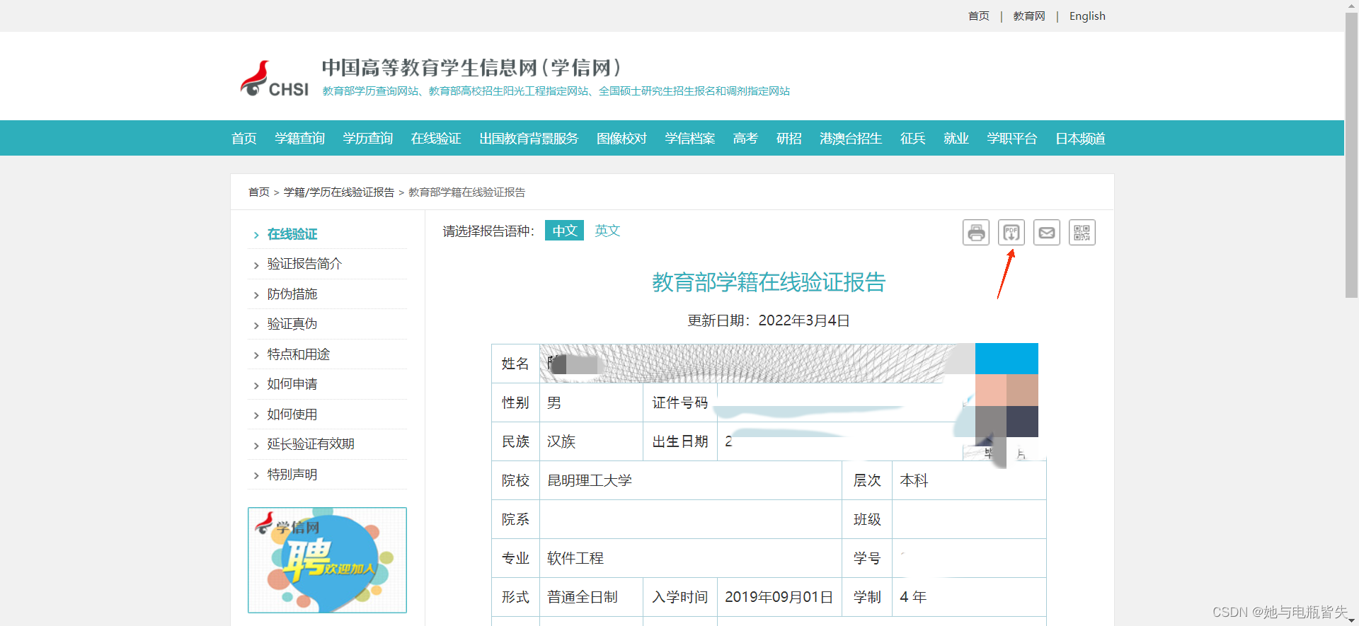 进入报告页面后,点击报告右方的PDF按钮,将学籍报告保存至本地
