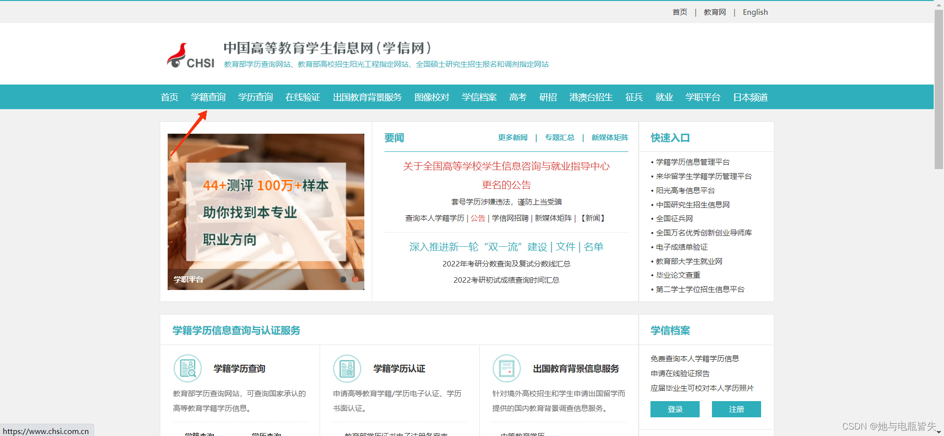 完成注册后回到首页 点击左上方导航栏的“学籍查询”字样