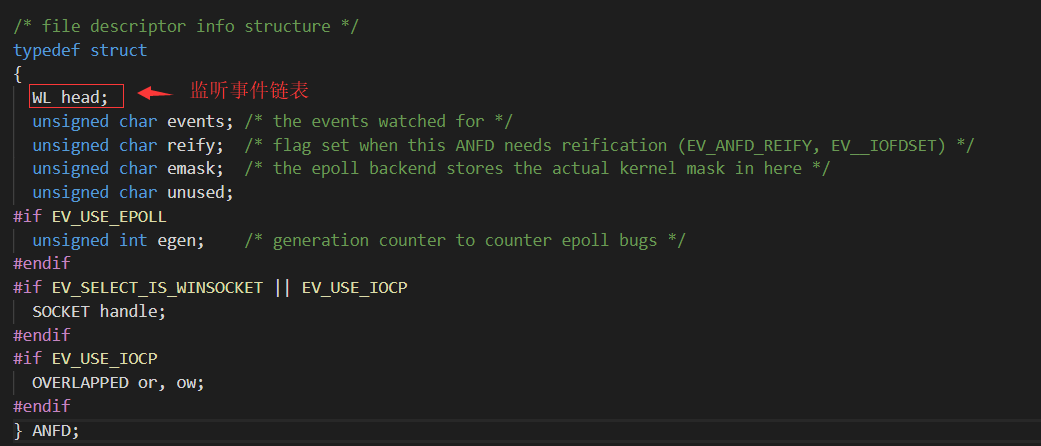 ANFD:用来记录对一个fd的所有监听事件,每一个监听事件使用链表结构进行组织。