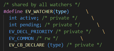 整个libev可能作者出于对代码复用减少重复代码的原因,大量使用宏定义,甚至用宏定义实现了简单的继承关系,这也使得整个项目代码看起来比较晦涩难懂。