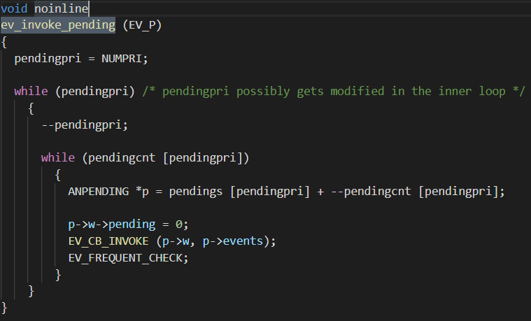loop->pendings记录管理当前已经发生等待调用回调函数的watcher集合,libev检查到事件发生后将对应的watcher加入到loop->pendings