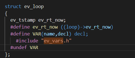 ev_loop结构体(loop为ev_loop结构的全局变量)的字段定义在ev_vars.h头文件中,然后在ev.c中通过include的方式导入