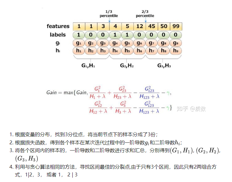 由于贪心算法需要对每个特征进行排序,因此成为计算速度的瓶颈。近似算法就是根据特征的分布提前计算得到分l个分位点,Sk=Sk1,Sk2,…,Skl, 有了这些分为点,就可以将样本映射到对应的区间内,然后再次聚合区间内的信息,得到所有区间的最佳分裂点。很直观, 这种方式免去了贪心算法需要对每个特征进行排序的操作。