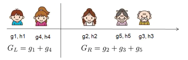 最原始的猜想就是枚举出所有可能的树结构,即特征值和分裂阀值,然后再根据目标函数计算比较出最优的选择。比如,当我们的结点按如下方式进行划分:(这里做了一个简单的年龄排序)