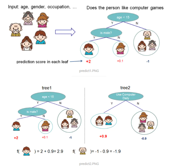 回到XGBoost算法,前文说到XGBoost模型是由一堆CART树构成的。XGBoost是由k个基模型(CART树)组成的一个加法模型,通过将每棵树的预测值加到一起作为最终的预测值.