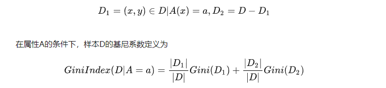 对于样本D,个数为|D|,根据特征A 是否取某一可能值a,把样本D分成两部分 D1和D2 。所以CART分类树算法建立起来的是二叉树,而不是多叉树。