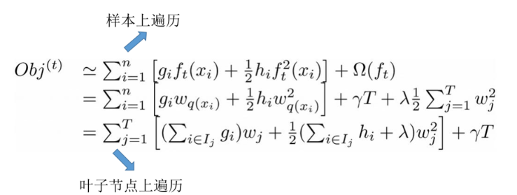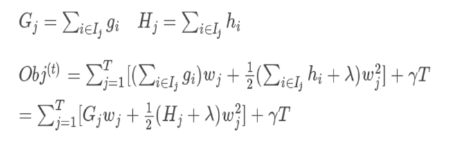 解释:首先这里边Ij表示一个叶子节点的集合,集合中每个值代表一个训练样本的序号,整个集合就是被第t棵CART树分到了第j个叶子节点上的训练样本。因为所有的样本最后都会被归属到一个确定的叶子节点上,因此可以将目标函数从样本数的遍历转换为了从叶子节点上的遍历。而归属到同一叶子节点的样本的Wq(x)是相同的,因此对于归属于同一叶子节点集合的样本我们可以用Wj来代替Wq(x)。