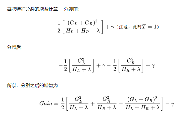 注意:这里出现了γ和λ,这是xgboost自己定义的,在使用xgboost时,你可以设定它们的值,显然,γ越大,表示越希望获得结构简单的树,因为此时对较多叶子节点的树的惩罚越大。λ越大也是越希望获得结构简单的树