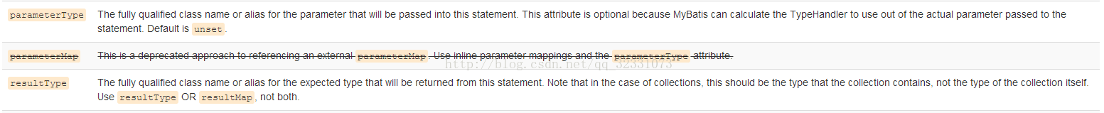 | parameterType | 将会传入这条语句的参数类的完全限定名或别名。这个属性是可选的,因为 MyBatis 可以通过 TypeHandler 推断出具体传入语句的参数,默认值为 unset。 |