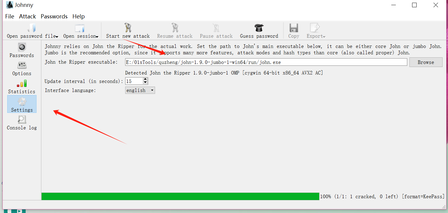 2、双击johnny.exe运行,在settings中配置john.exe的路径