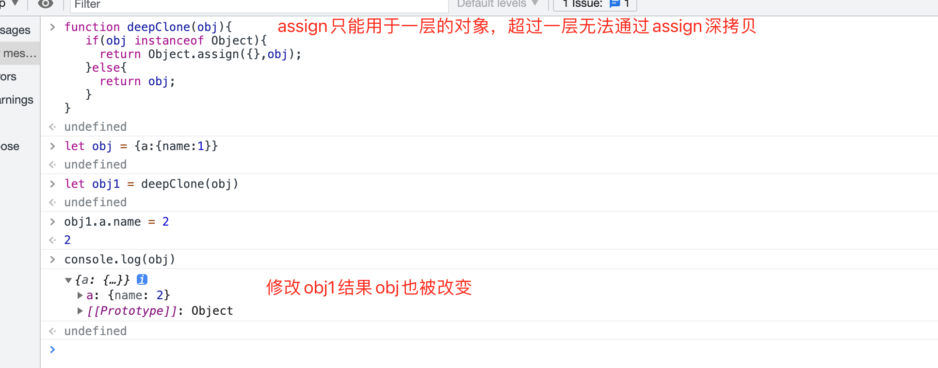 注意:Object.assign()并非真正意义上的深拷贝,因为如果被拷贝的对象层数超过1层,那么就无 法通过Object.assign()深拷贝,如下图