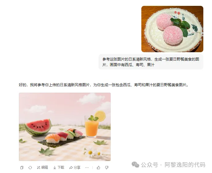 如果你看到了某一种风格的图片很喜欢,想生成类似风格的图片用于笔记。可以上传这张图片,然后让豆包参考该图片风格,结合你的笔记内容生成新的图片。例如,你上传了一张日系清新风格的美食图片,希望生成关于夏日野餐美食的同风格图片,指令可以是 “参考这张图片的日系清新风格,生成一张夏日野餐美食的图片,画面中有西瓜、寿司、果汁” 。具体如下: