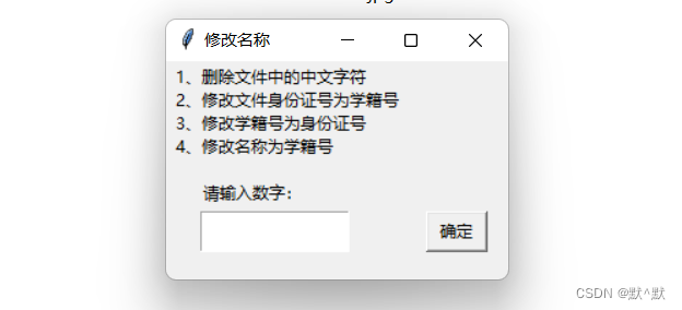 Python 根据Excel修改文件名称 封装成.exe程序 公司想要一个可以在任何一个Windows电脑上能使用的工具,可以根据Excel表格内容来修改图片的名称,我本来打算用bat脚本实现,但是我发现bat不能读取Excel表格,所以我又想到了用python脚本来实现。实现功能:1、删除文件中的中文字符2、修改文件身份证号为学籍号3、修改学籍号为身份证号4、修改名称为学籍号