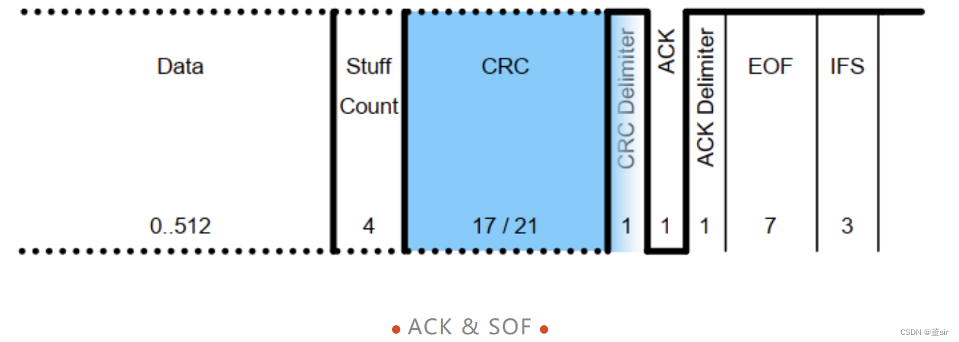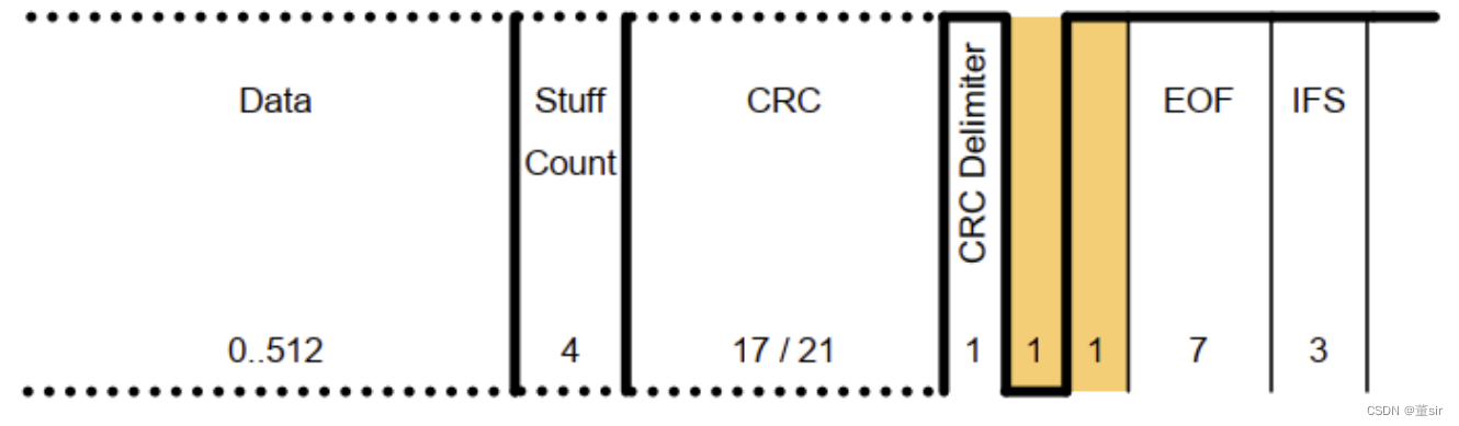 相比于传统CAN,在CAN FD中最多可接受2个位时间有效的ACK,允许1个额外的位时间来补偿收发器相移和传播延迟)。EOF(End of frame)同样由连续7个隐性位来表示。