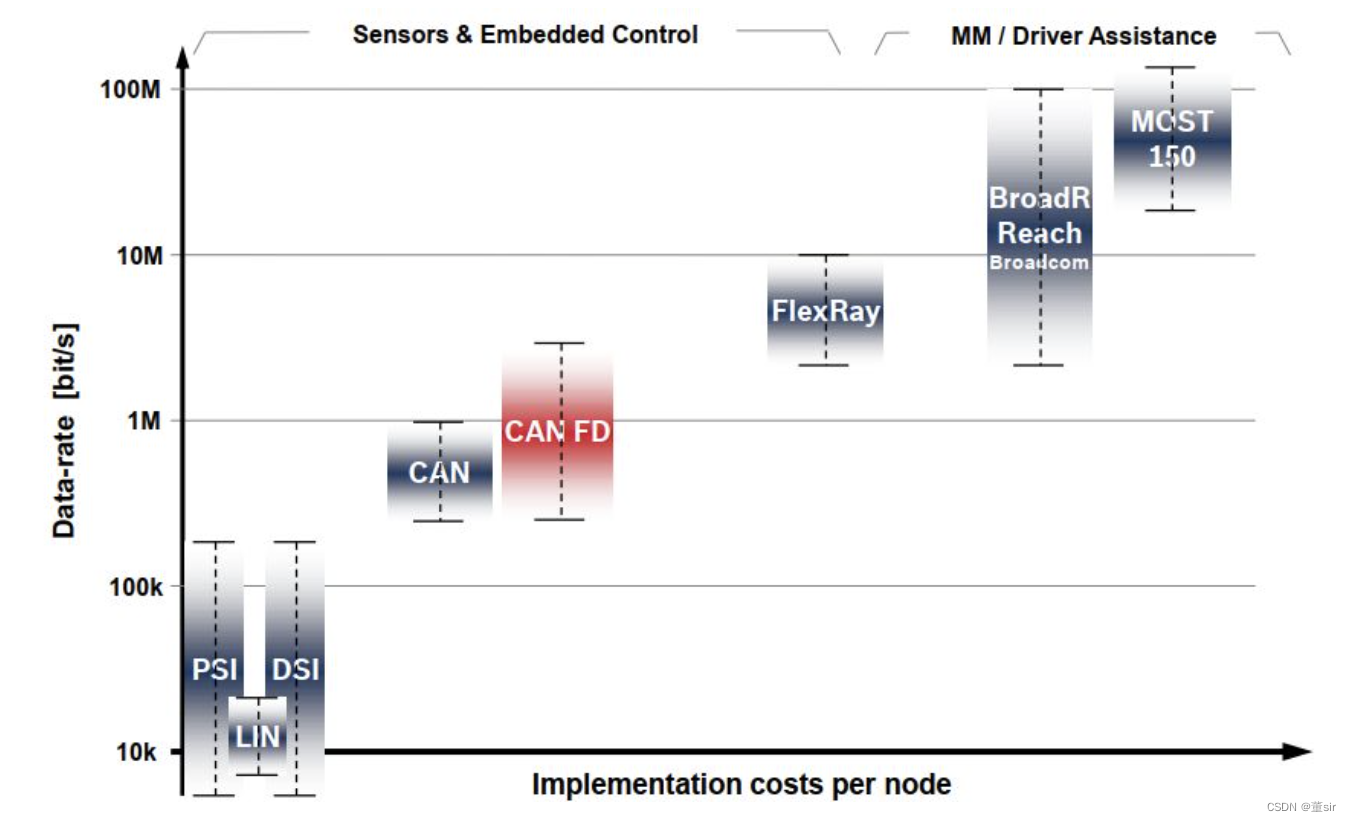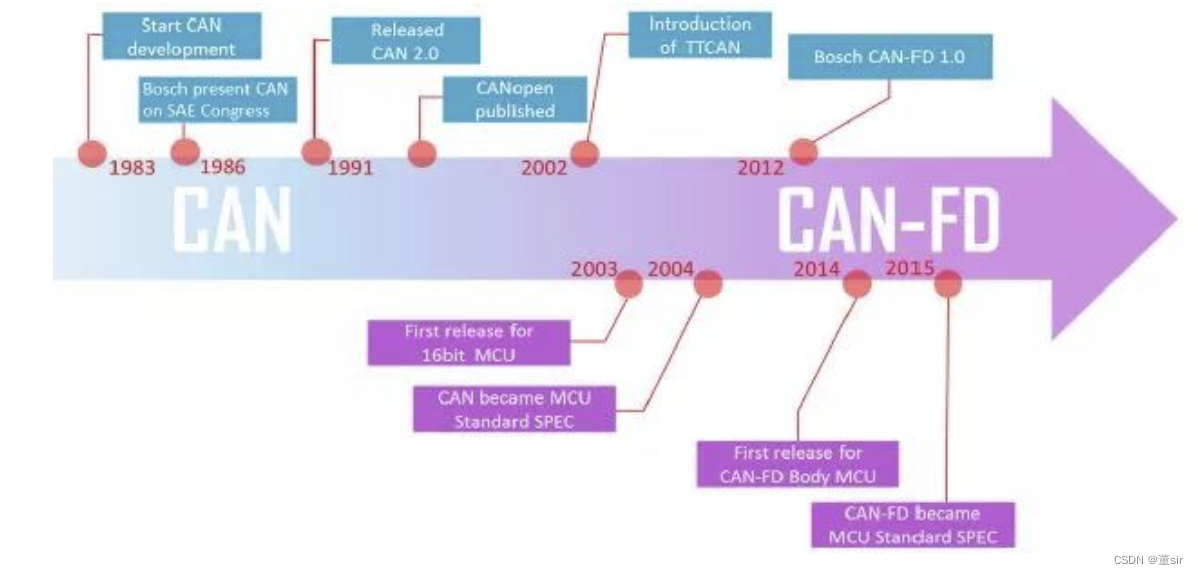 为了缩小CAN网络(Max:1MBit/s)与FlexRay(Max:10MBit/s)网络的带宽差距,BOSCH推出了CAN FD方案。CAN FD(CAN with Flexible Data rate)继承了CAN总线的主要特性。