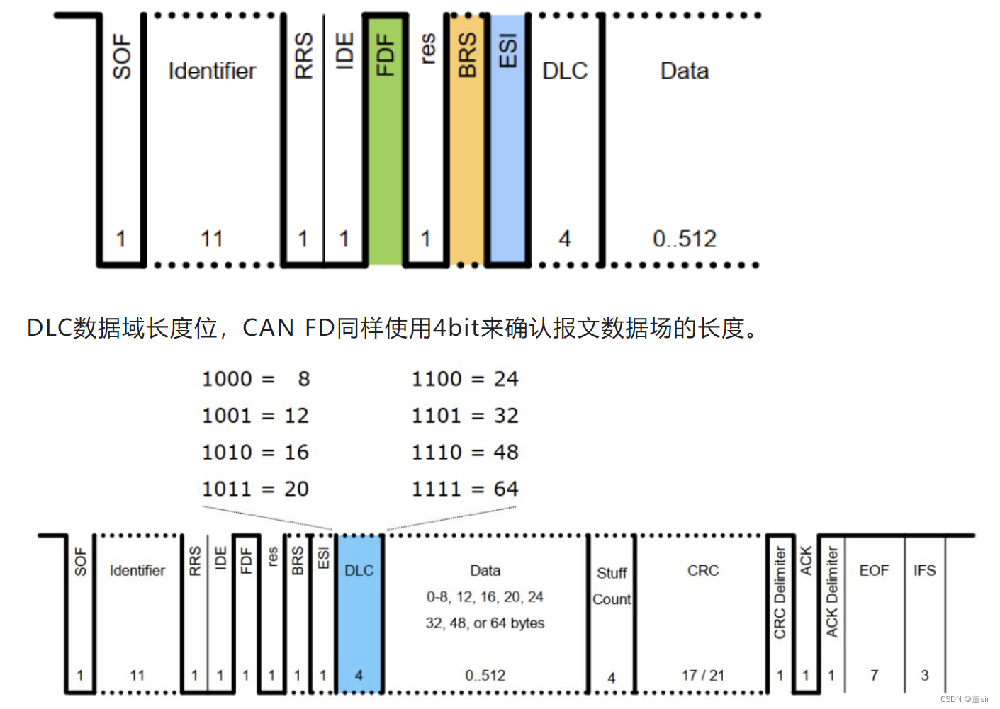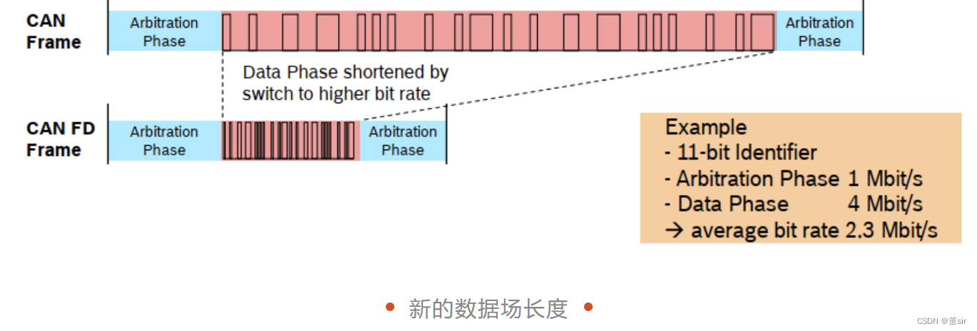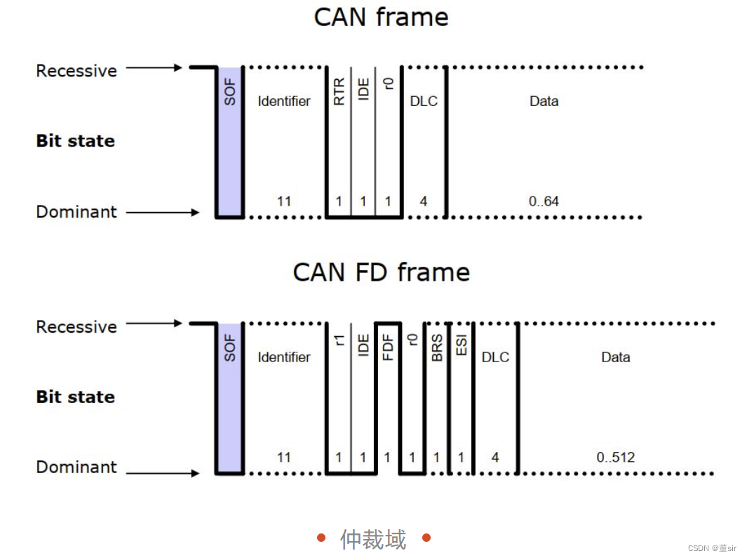 与传统CAN相比,CAN FD取消了对远程帧的支持,用RRS位替换了RTR位,为常显性。IDE位仍为标准帧和扩展帧标志位,若标准帧与扩展帧具有相同的前 11 位 ID,那么标准帧将会由于 IDE 位为 0,优先获得总线。