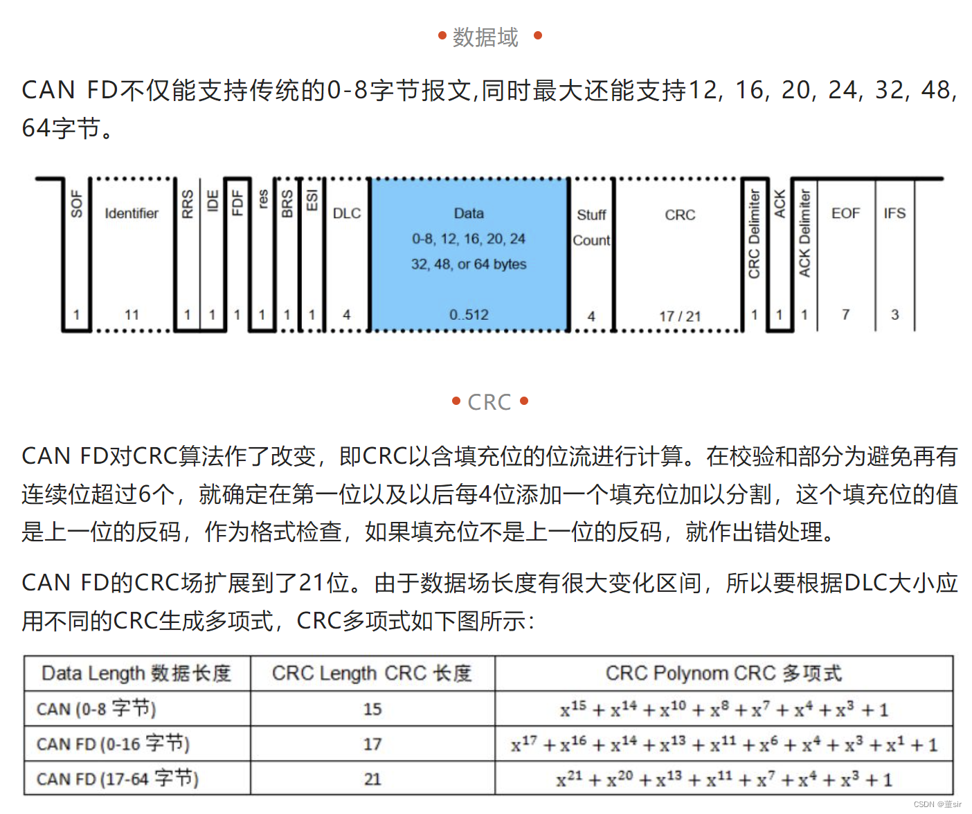 CAN FD对数据场的长度作了很大的扩充,DLC最大支持64个字节,在DLC小于等于8时与原CAN总线是一样的,大于8时有一个非线性的增长,所以最大的数据场长度可达64字节。