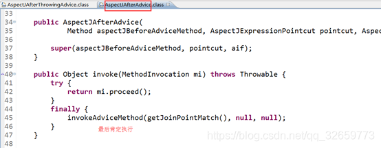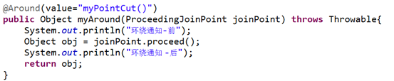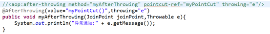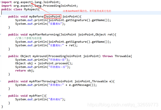 aop联盟定义通知类型,具有特性接口,必须实现,从而确定方法名称。 aspectj 通知类型,只定义类型名称,以及方法格式。 个数:6种,知道5种,掌握1中。 before:前置通知(应用:各种校验) 在方法执行前执行,如果通知抛出异常,阻止方法运行 afterReturning:后置通知(应用:常规数据处理) 方法正常返回后执行,如果方法中抛出异常,通知无法执行 必须在方法执行后才执行,所以可以获得方法的返回值。 around:环绕通知(应用:十分强大,可以做任何事情) 方法执行前后分别执行,可以阻止方法的执行 必须手动执行目标方法 afterThrowing:抛出异常通知(应用:包装异常信息) 方法抛出异常后执行,如果方法没有抛出异常,无法执行 after:最终通知(应用:清理现场) 方法执行完毕后执行,无论方法中是否出现异常 |