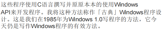 Windows被开发出来之后,向上提供了一套16/32位的API接口,我们称之为Win16/Win32,当然Win16已经随着16位Windows操作系统被淘汰,但是Win32 API接口一直延续到现在;早期的应用程序都是采用C/C++配合Win32 API去构建和开发出来的,这种方式我们称之为Windows古典应用程序开发!