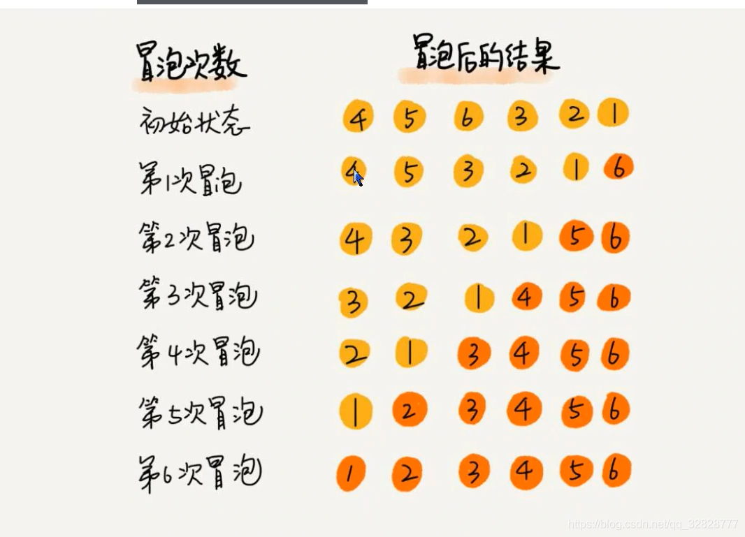 * 基本思想: 冒泡排序,类似于水中冒泡,较大的数沉下去,较小的数慢慢冒起来。