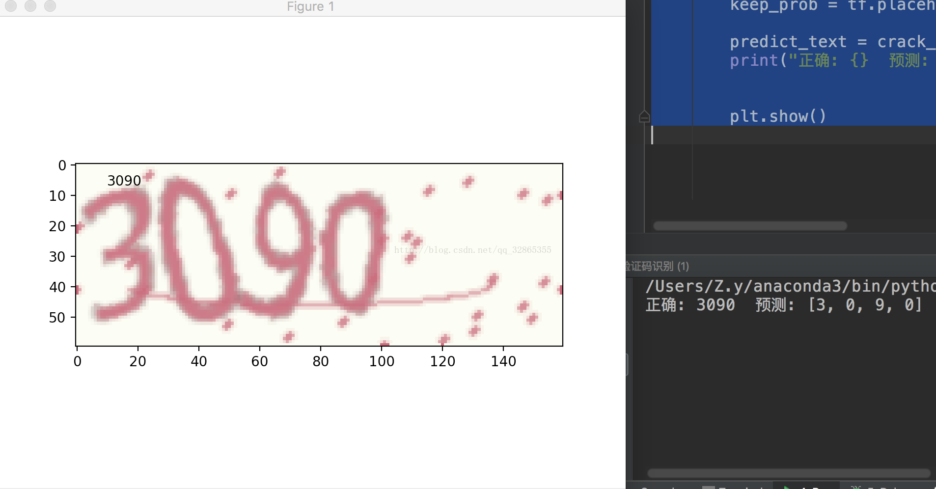 基于python生成验证码,并用CNN进行训练识别,验证码四位,如果由数字,小写字母,大写字母组成,那么cpu要跑很久很久,所以这里的验证码只包含了四位数字,一共有10*10*10*10个可能的数据。通过卷积神经模型,准确率达到了99%,大约迭代1200次左右,运行时间不算太长!!下面附上代码和效果图!!!!具体的细节就不介绍了,最近有点忙~~~,有问题可以评论!!!我会解答!!另外附上我另一个博客地址,我会尽力经常更新,因为楼主还在上学,如果比较忙的话,可能更新会慢点!点击打开链接