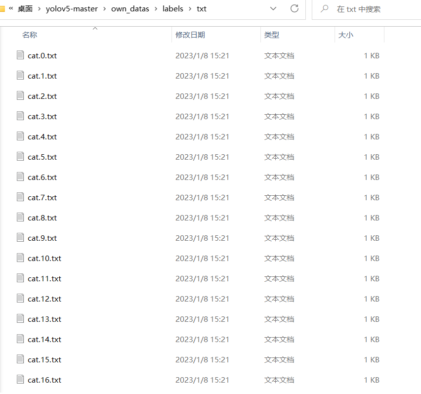 最后一步,把txt文件夹中的文件全部复制到yolov5-master\own_datas\labels\train文件夹中。