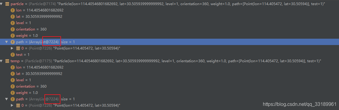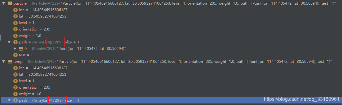 用BeanUtils.copyProperties()将particle拷贝到temp时,由于path是一个链表,此时并不会拷贝值,而是一个引用,本质上path还是一个对象,这在运算中可能是致命的。