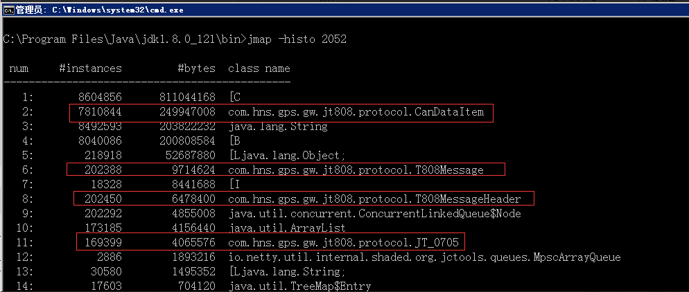 修改代码再将T808Message等类用完了的地方做了释放,之后终于解决了问题!修改代码以后再次使用jmap统计如下,正常了!