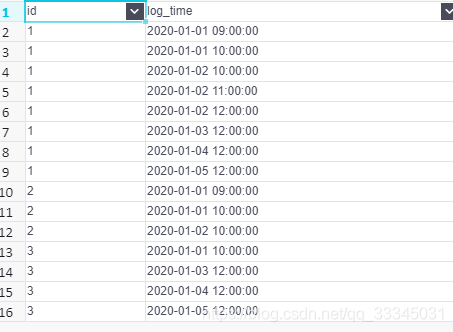 select 2 as id,'2020-01-02 10:00:00' as log_time