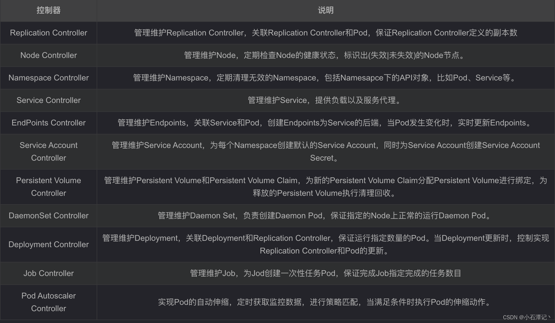 新建立的Pod进行节点(node)选择(即分配机器),负责集群的资源调度。组件抽离,可以方便替换成其他调度器。Controller