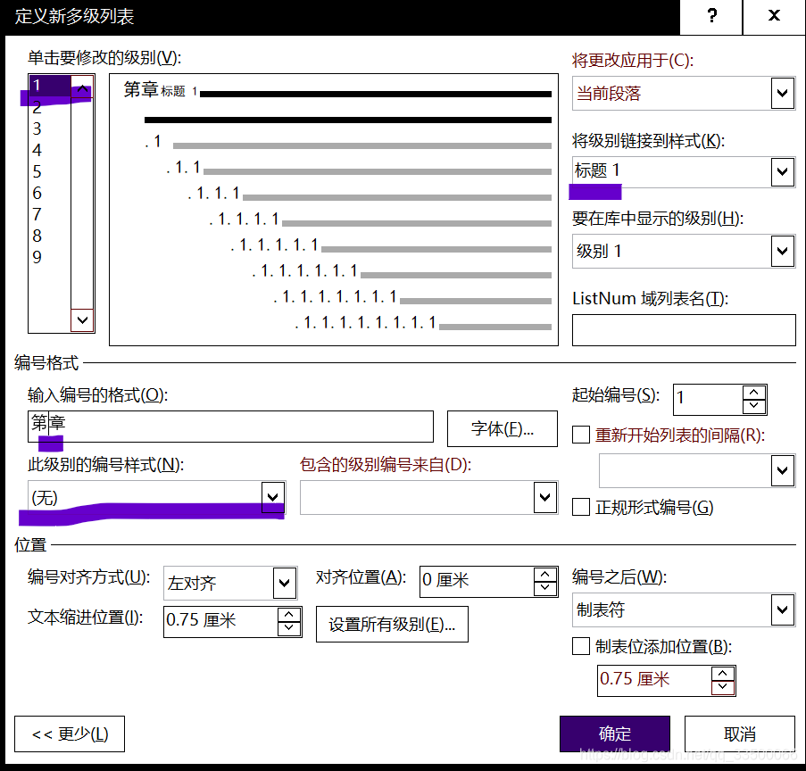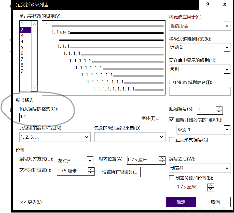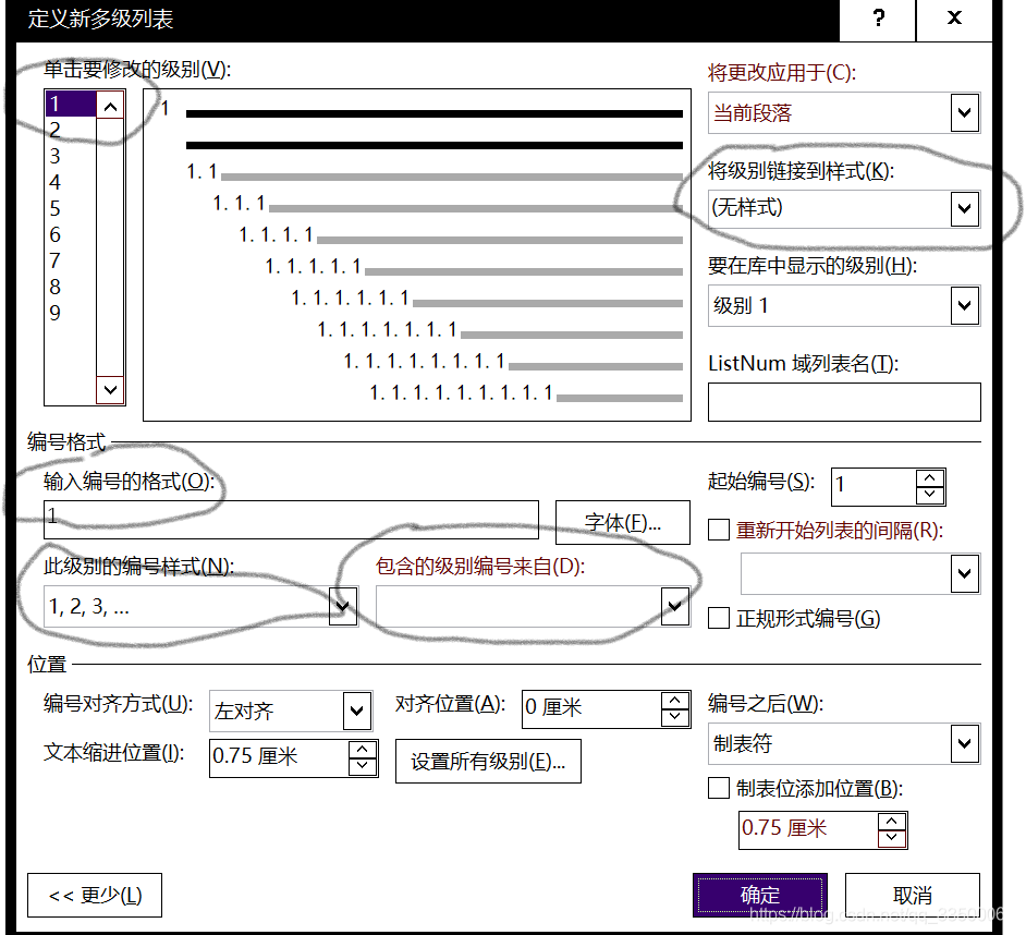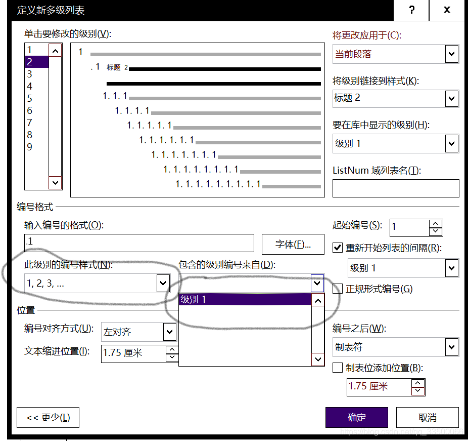 - 下方【编号样式】 或 中下【包含级别编号来自】选择后 会在【编号格式】"光标停留处” 加上一个编号(自己手动打上的话无效,不会自动增加),