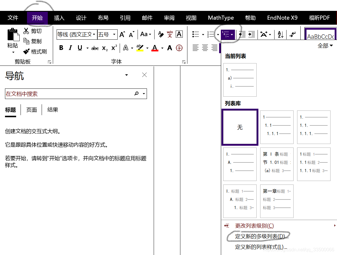 - 上方菜单栏--开始--列表,选择定义新的多级列表