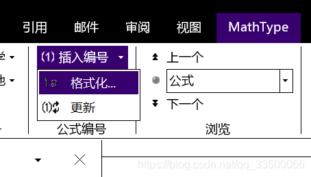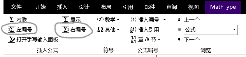 使用 菜单栏--MathType--左编号或右编号,会弹出让你输入公式的框,输入公式后就自动带上编号信息,左右表示公式编号出现在公式那边