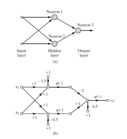 很显然,无法找出一条直线作为决策边界可以使(0,0)和(1,1)在一个区域,而(1,0)和(0,1)在另一个区域。然而,可以使用如下图所示的一层有两个隐藏神经元的隐藏层来解决异或问题。