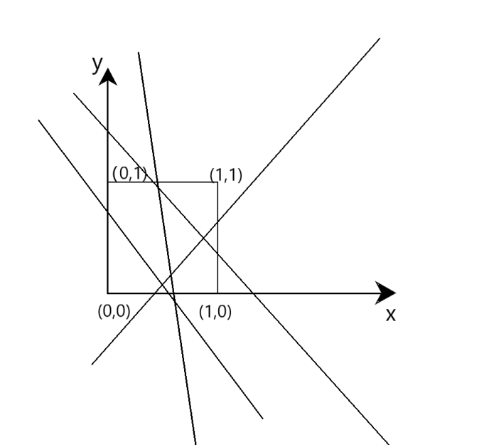输入模式(0,0)和(1,1)是单位正方形的两个相对的角,但它们产生相同的结果是0。另一方面,输入模式(0,1)和(1,0)是单位正方形另一对相对的角,但是它们属于类1,即