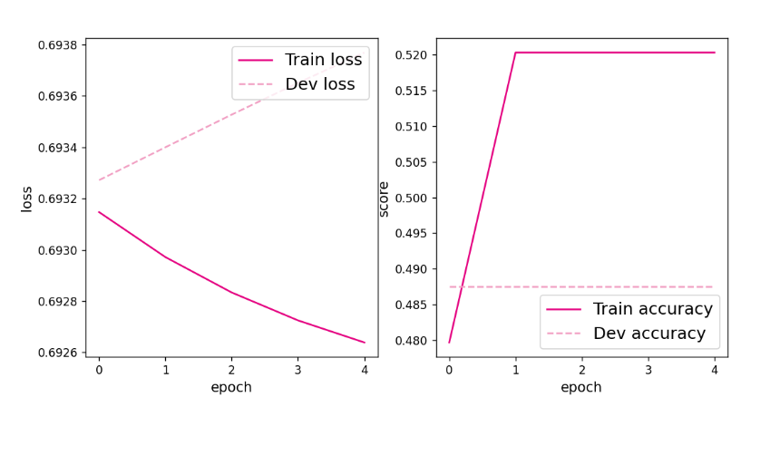 从输出结果看,二分类准确率为50%左右,说明模型没有学到任何内容。训练和验证loss几乎没有怎么下降。