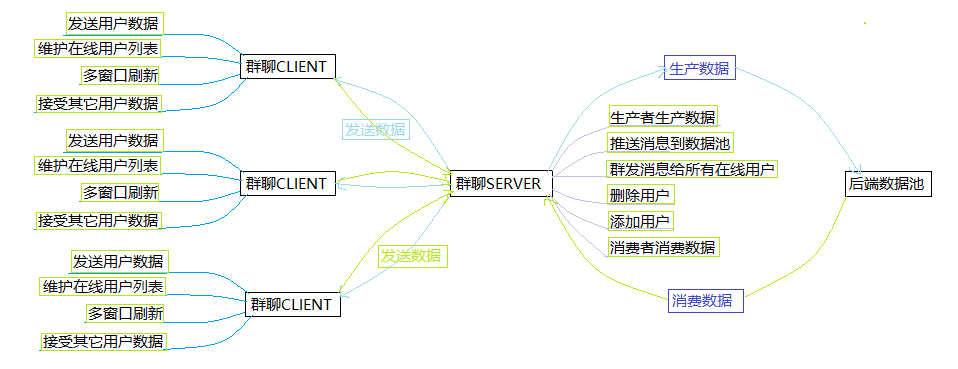 server当然也要接收来自client的消息,并给client发送消息。那么接收到的消息先放到哪呢?我是这样实现的。server维护一个后端数据池。将从client接收到的数据全部放入后端数据池中,然后从数据池中取出数据依次发给每一个在线好友(所以也要有记录在线好友的结构,我用了map,,存放好友的套接字信息)。当然还要实现在线好友的添加与删除,即client输入quit,clinet退出,server将该client从在线好友列表中删除。