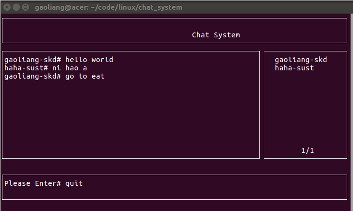 client要完成的功能当然首先就是数据的接收和发送了(都从server接收和发送给server),其次,作为一个client,没有一个窗口界面都不好意思出来混,所以借助ncurse库的窗口函数来实现多窗口界面。因为要将一个终端界面划分为4个窗口:分别是提示窗口(显示应用名称),消息窗口(显示聊天消息),输入窗口(数据输入),好友列表(在线用户列表),然后需要用到多线程的技术,让这四个窗口各自刷新。同时,它们访问的资源显示器所谓临界资源,所以需要信号量来实现互斥访问机制。