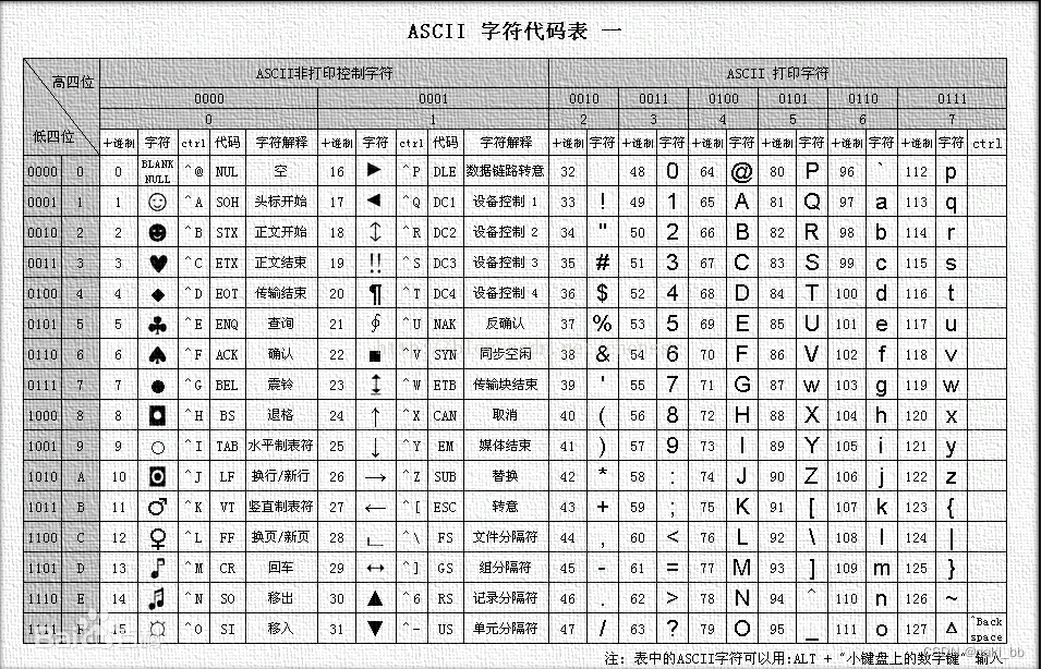 ASCII(American Standard Code for Information Interchange,美国信息交换码):包含数字、英文、符号