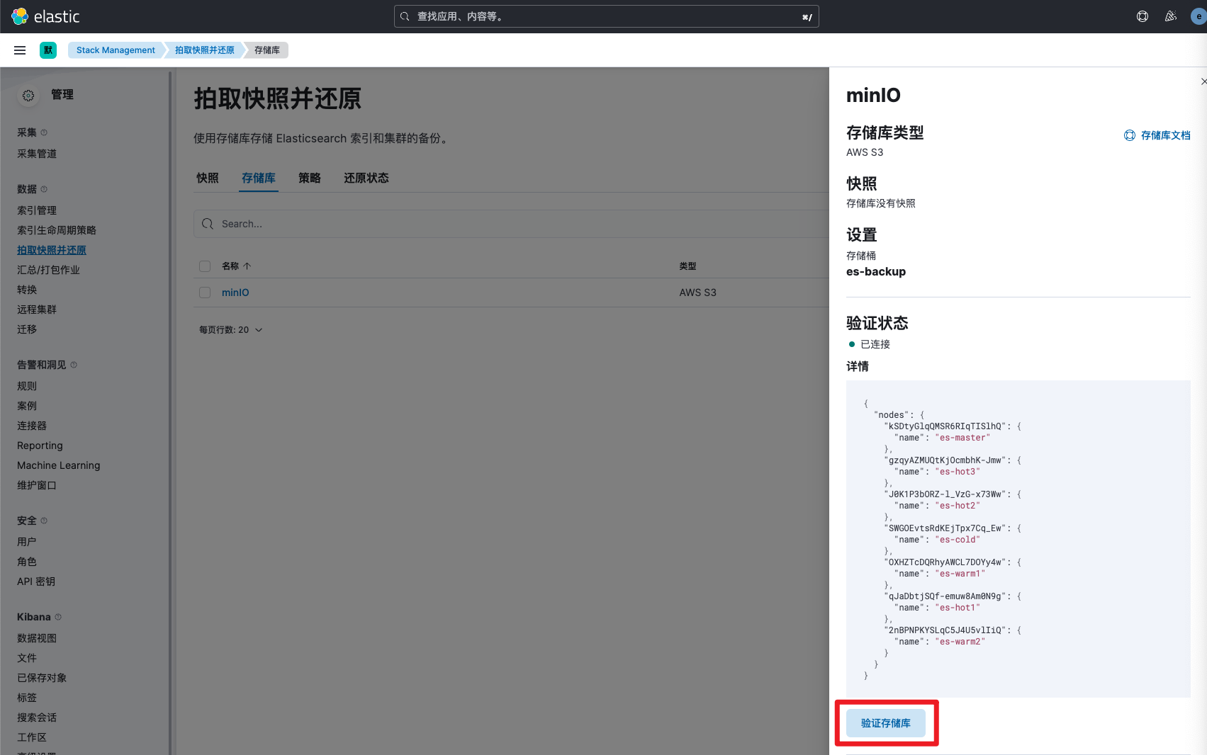登录kibana——>点击菜单按钮——>Stack Management——>拍摄快照并还原——>存储库——>注册存储库,然后设置名称并选择类型为AWS S3