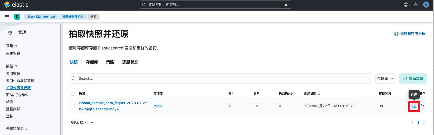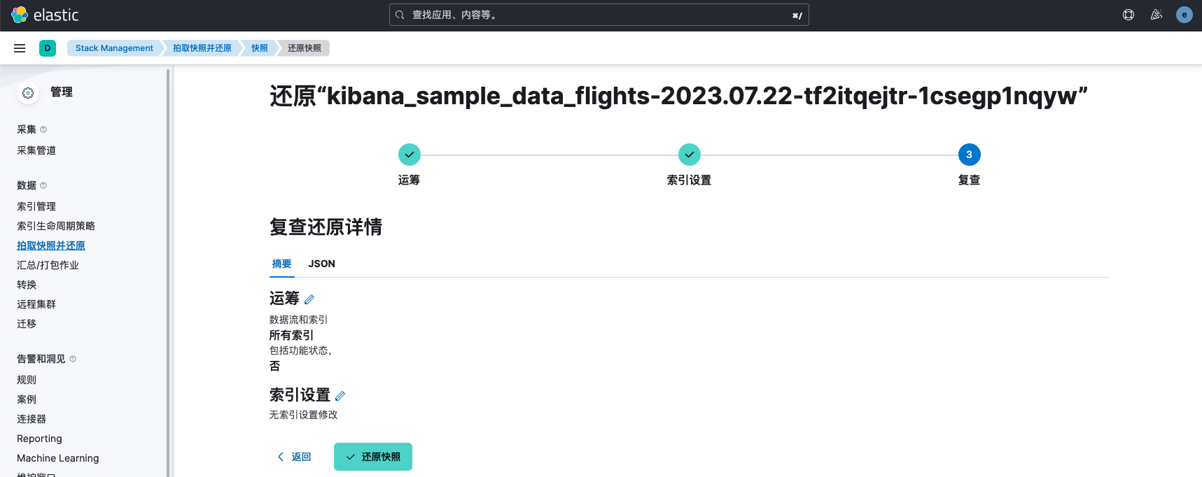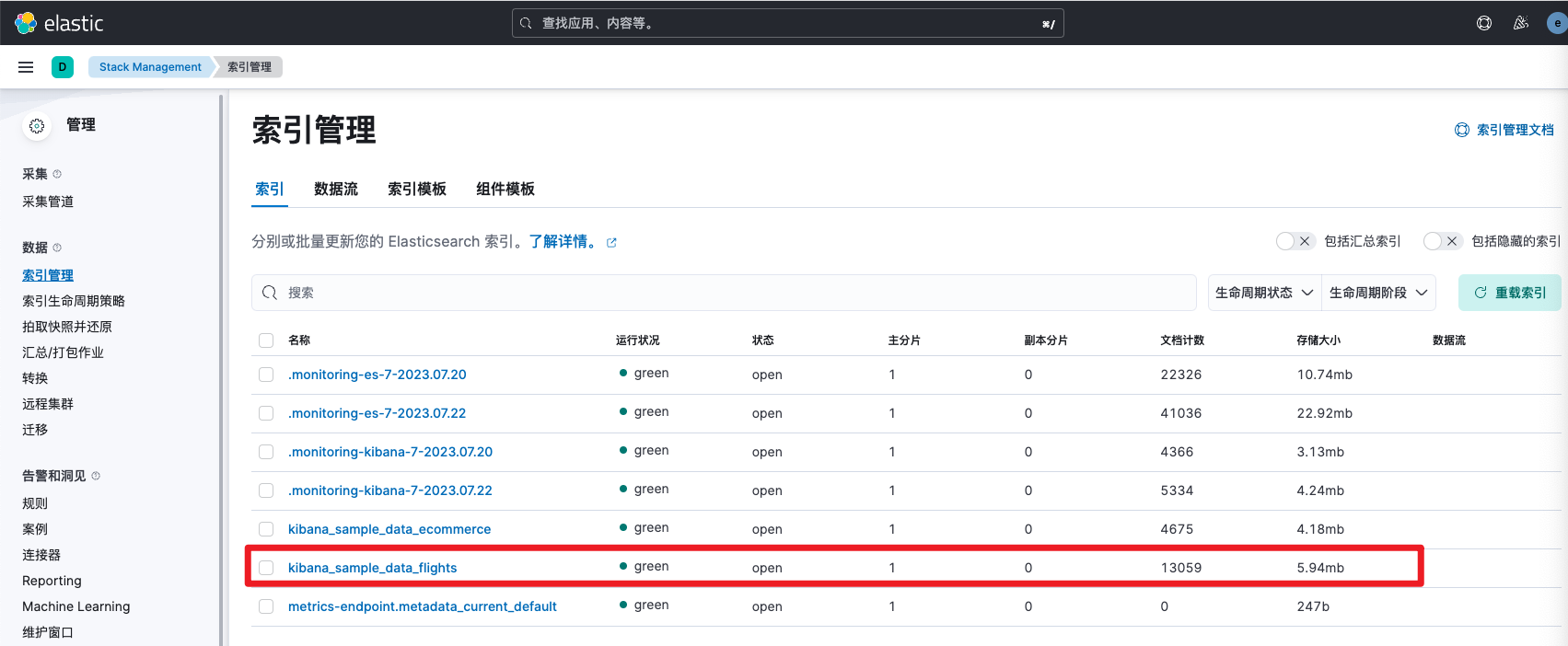 接下来,我们以导入的kibana_sample_data_flights索引为例,演示数据的备份与恢复。