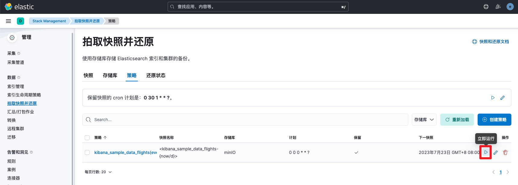 创建完策略后,es会在每天8点自动将数据上传至minIO增量备份,我们也可以点击立即执行,手动触发一次备份任务操作。