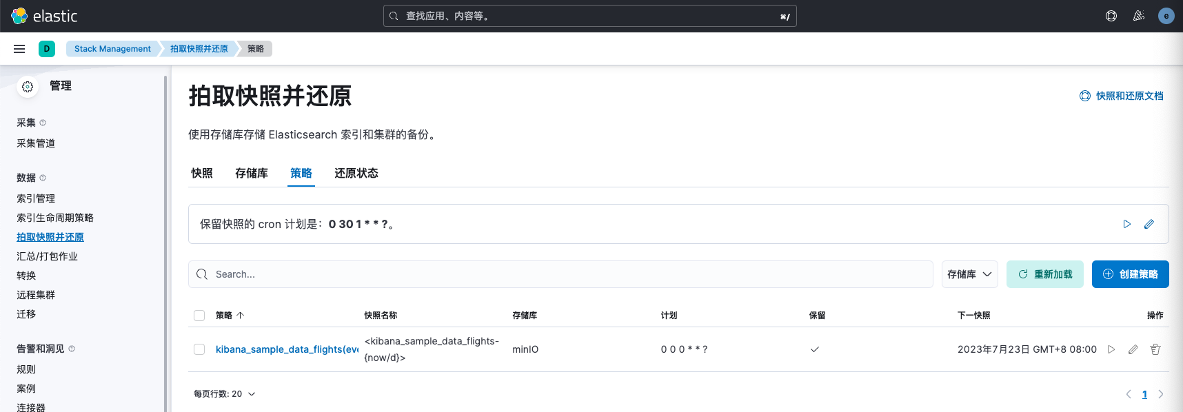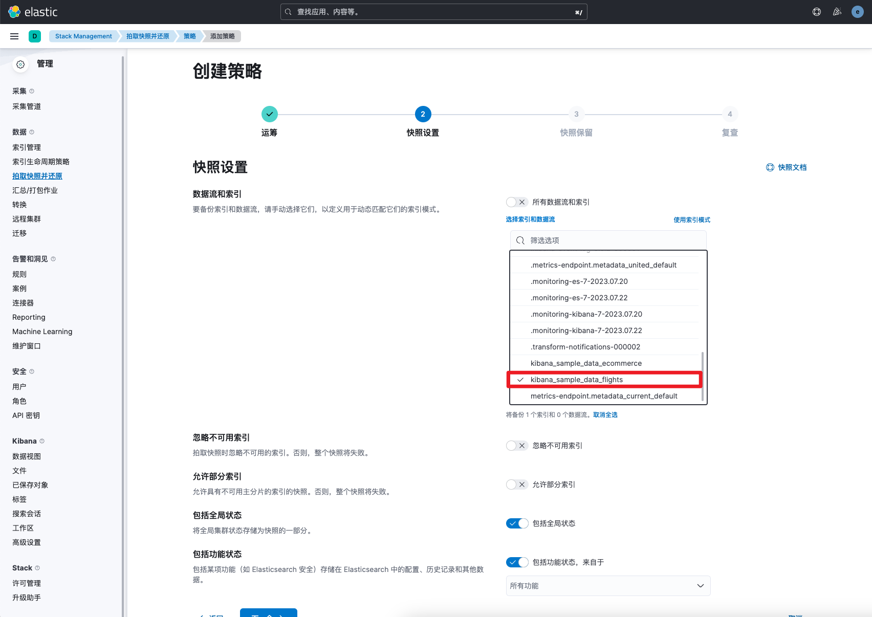 创建备份策略,名称自定义,快照表达式填写<kibana_sample_data_flights-{now/d}>