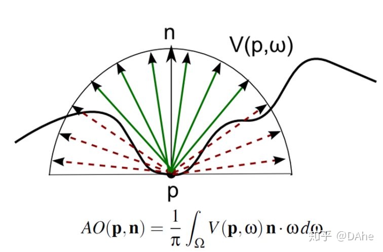 在大部分情况下,AO通过构造一个发射光线的半球(hemisphere)来计算。半球上表面布满朝各个方向发射的光线,然后判断这些光线是否与其它的物体相交。如果光线到达背景或者天空,那么就增加这个光线发出点的表面亮度,如果与其他物体相交,则不用。