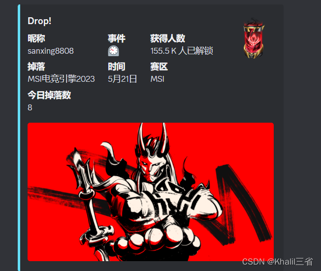 Github电竞助手链接github上项目电竞助手(EsportsHelper)的掉落提醒配置教程,当有掉宝的时候会发送你信息提示.至于这个脚本是怎么使用的简单说一下,就是通过自动观看英雄联盟直播 从而获取奖励(仅限直营服),有兴趣的可以去github上看readme,非常详细,支持简中,繁中,英语,西班牙语.钉钉Discord饭碗警告企业微信Discord(需要魔法) >企业微信>=钉钉饭碗警告。