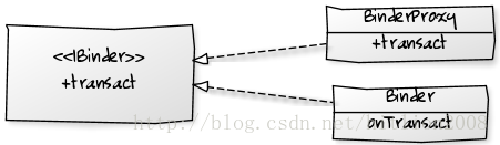 Binder的主要组成有三个IInterface, IBinder, Binder和BinderProxy。但是我们需要关注的仅是Binder对象和BinderProxy。其中BinderProxy是给客户端使用的,客户端通过调用其上的transact来marshalling数据,并且向底层发送消息;Binder是给服务端使用的,服务端要实现onTransact方法,以便处理客户端的方法调用请求并返回结果。IInterface接口主要是给系统使用的,用于在ServiceManager中查找对应的Service。它们之间的关系是: