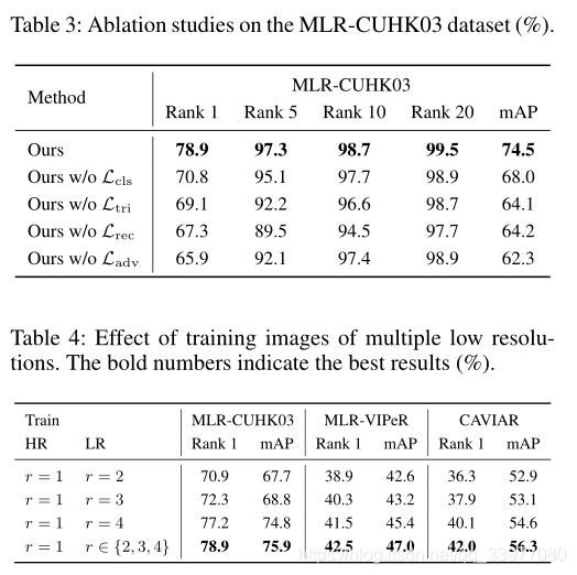 在MLR-CUHK03使用多级判别器,表3说明了消融研究: