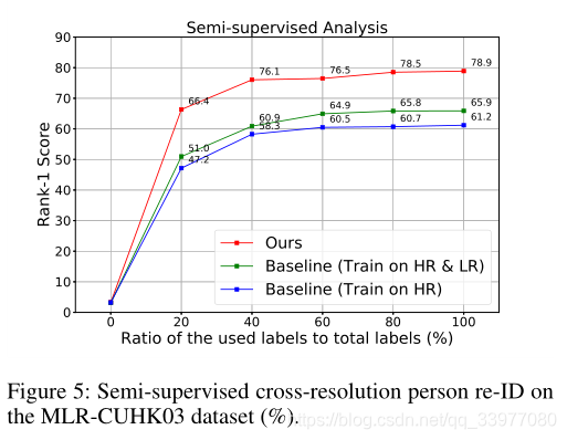 在MLR-CUHK03数据集上的分析:模型执行跨分辨率人员重标识以端到端的学习方式进行训练;不会受到visual artifacts的影响,因为没有使用SR的模型。这两个原因导致效果能比其他方法好。